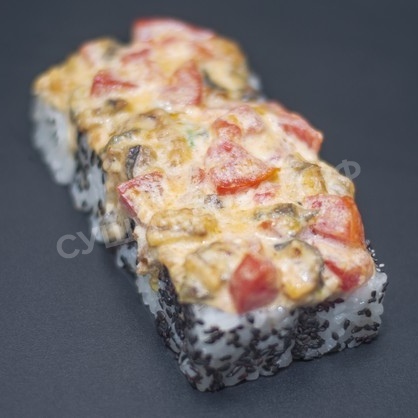Нори, рис, кунжут, сыр креметте, омлет, перец сладкий, соус "яки", угорь, помидор.