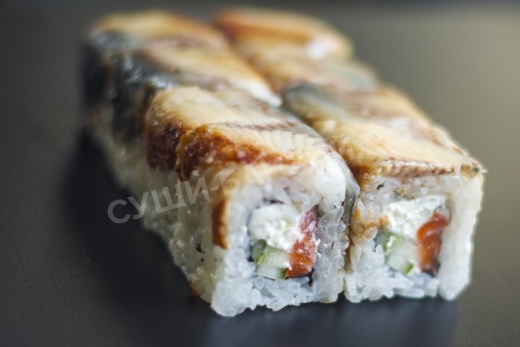 Нори, рис, сыр креметте, лосось, огурец, авокадо, угорь, соус унаги, кунжут.