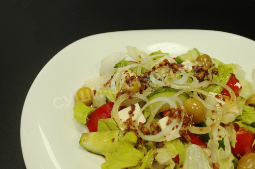 Салат микс, помидор, огурец, перец сладкий, сыр брынза, лук сладкий, оливки, соус "греческий".