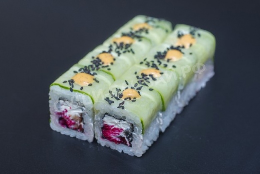 Нори,рис,омлет,перец сладкий,авокадо,сыр креметте, икра массага, огурец,соус спайси.