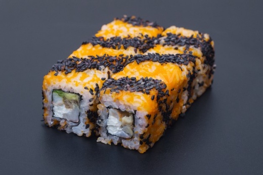 Нори,рис,угорь,креветка тигровая,сыр креметте,огурец,авокадо,икра массага.
