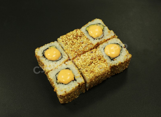 Нори, рис, кунжут, лук порей, креветка тигровая, соус "спайси".