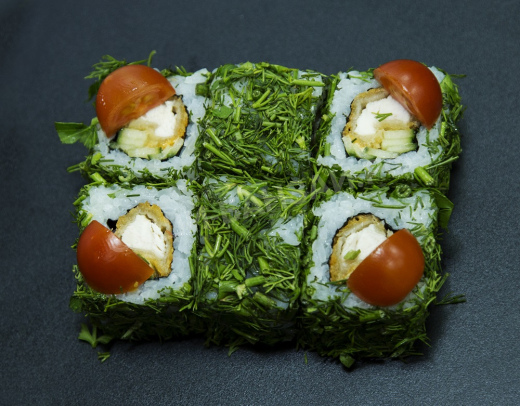 Нори,рис,куриное филе,кляр,майонез,огурец,зелень,помидор черри.